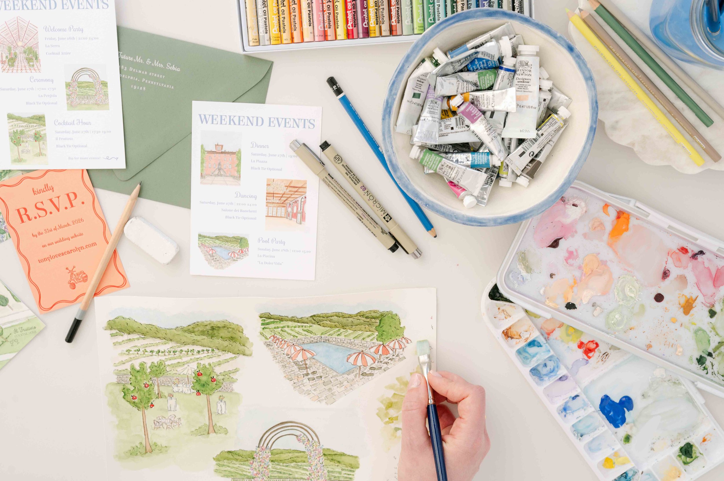 Watercolor Artist + Wedding stationery DesignerHand-painted watercolor artwork is at the heart of everything I do - from custom venue illustrations and maps to wedding crests and florals, each piece is created from scratch to tell your love story in a way that's entirely your own.